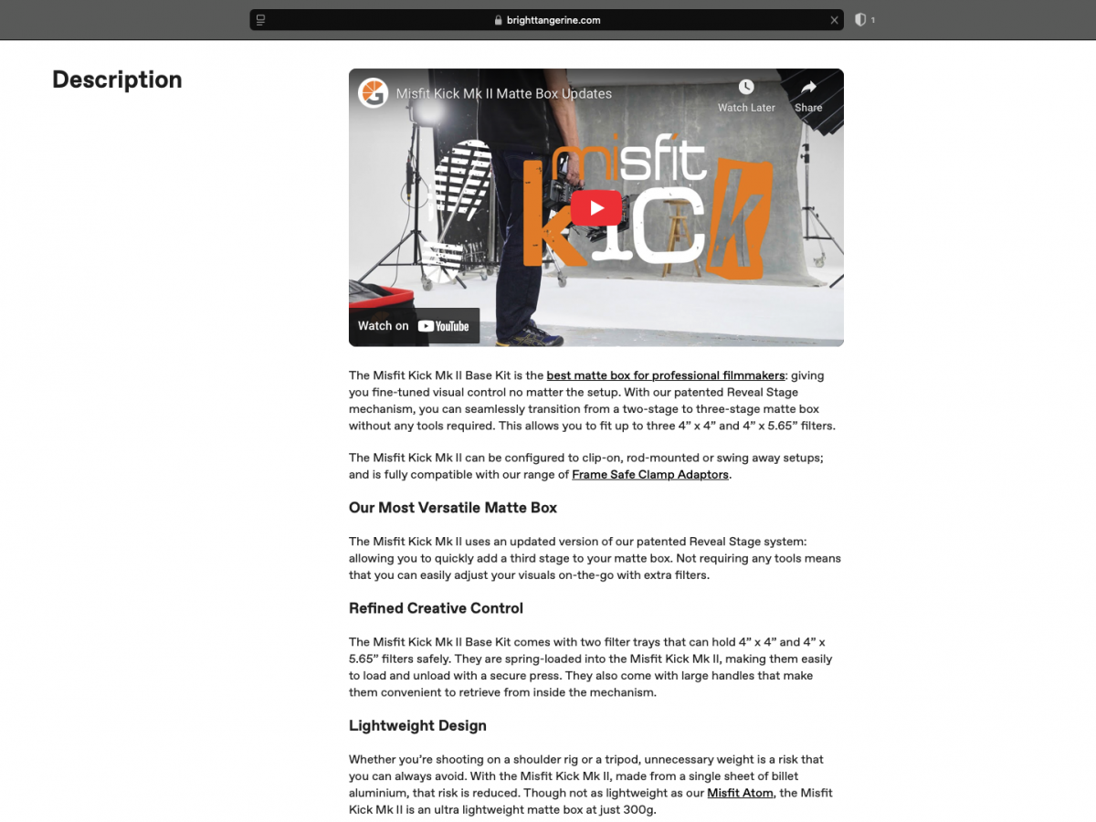 For Bright Tangerine, I created SEO-focused landing pages and product descriptions for their industry-leading matte box range and related filmmaking accessories. The goal was to increase organic visibility while driving conversions through clear, informative, and technically accurate content tailored to a highly knowledgeable audience.