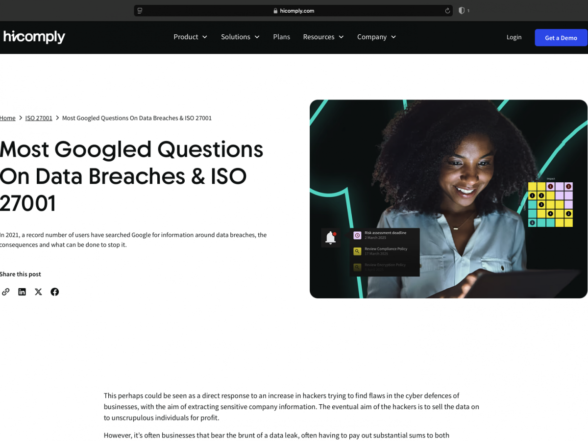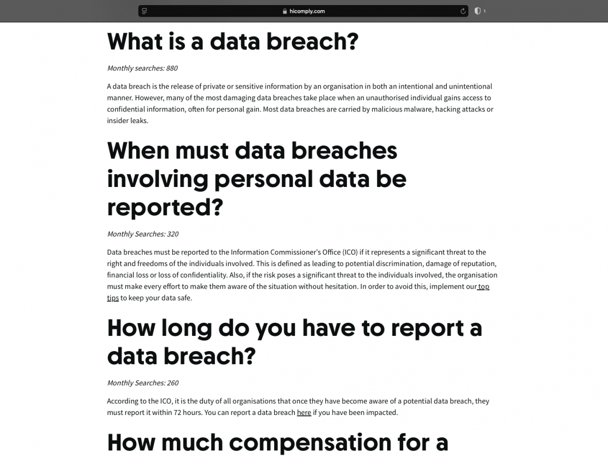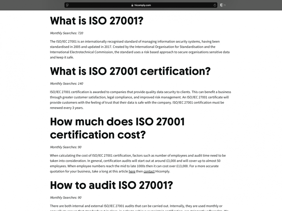 Working with Hicomply at Curtis Gabriel (now Conversion Interactive Agency),  I created SEO-optimised articles and content hubs aimed at increasing organic traffic and positioning the brand as a thought leader in the cybersecurity and compliance space. My work focused on high-intent, keyword-driven topics such as ISO 27001, data breaches, and information security — crafted to attract search traffic while providing genuinely helpful content to users.
